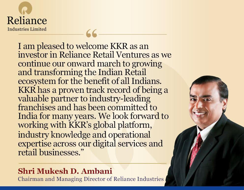 रिलायंस इंडस्ट्रीज के चेयरमैन और प्रबंध निदेशक मुकेश अंबानी ने कहा, “मैं रिलायंस रिटेल वेंचर्स में एक महत्वपूर्ण निवेशक के रूप में केकेआर का स्वागत करते हुए प्रसन्न महसूस कर रहा हूं। प्रत्येक भारतीय के लाभ के लिए हम भारतीय रिटेल ईको-सिस्टम को विकसित करने और बदलने के लिए आगे बढ़ते रहेंगे। हम अपने डिजिटल सेवाओं और रिटेल बिजनेस में केकेआर के ग्लोबल प्लेटफॉर्म, इंडस्ट्री नॉलेज और ऑपरेशनल एक्सपर्टिस का लाभ लेने को तैयार हैं”