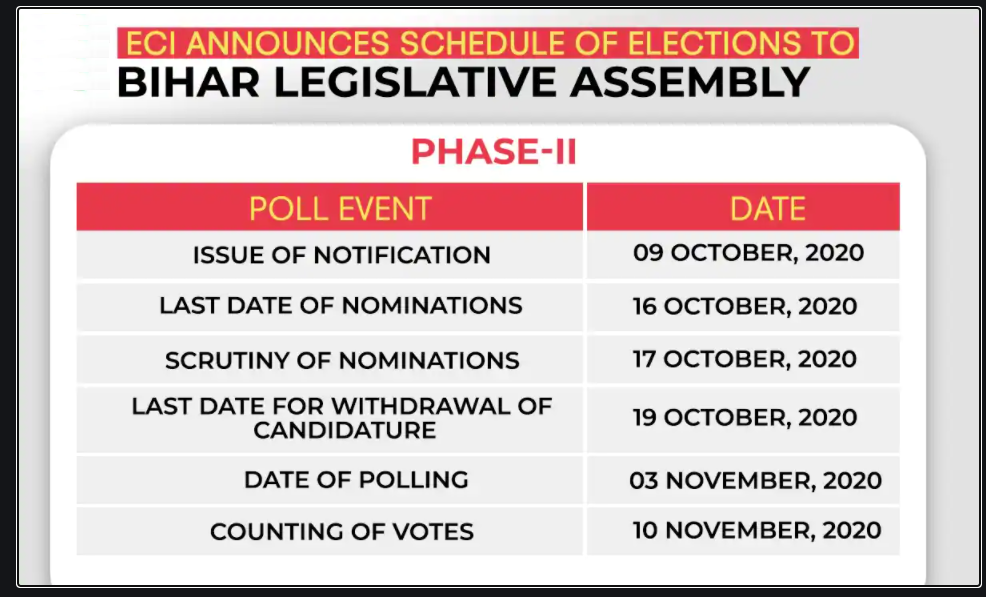 गौरतलब है कि बिहार विधानसभा की 243 सीटों के लिए तीन चरण में 28 अक्टूबर, 03 नवंबर और 07 नवंबर को मतदान कराया जाना है। दस नवंबर को मतगणना होगी और चुनाव की प्रक्रिया 12 नवंबर तक पूरी हो जायेगी। बिहार विधानसभा का वर्तमान कार्यकाल 29 नवंबर 2020 को समाप्त हो रहा है।