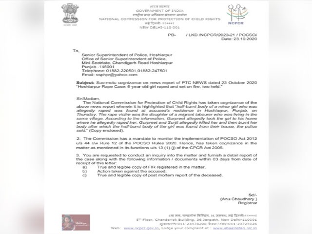 उल्लेखनीय है कि 21 अक्तूबर को 6 साल की बच्ची की कथित रेप के बाद हत्या करके उसकी अधजली लाश हवेली में छिपाकर रख दी गई थी। उधर, पंजाब के मुख्यमंत्री कैप्टन अमरिन्दर सिंह ने पंजाब के डीजीपी को निर्देश दिए हैं कि मामले की सही जांच को यकीनी बनाया जाए और चालान जल्द अदालत में पेश किया जाए ताकि आरोपियों को सख्त सजा मिल सके। इस मामले में आरोपियों गुरप्रीत सिंह और उसके दादा सुरजीत सिंह को हत्या, रेप के आरोपों और भारतीय दंड संहिता तथा यौन अपराधों से बच्चों का संरक्षण (पॉक्सो) अधिनियम की अन्य संबंधित धाराओं के तहत गिरफ्तार किया गया है। पीड़िता एक प्रवासी मजदूर की बेटी थी, जो उसी गांव में रह रहा था। पीड़िता के पिता के अनुसार गुरप्रीत कथित तौर पर उनकी लड़की को अपने घर ले गया जहां उसने कथित तौर पर उससे रेप किया।