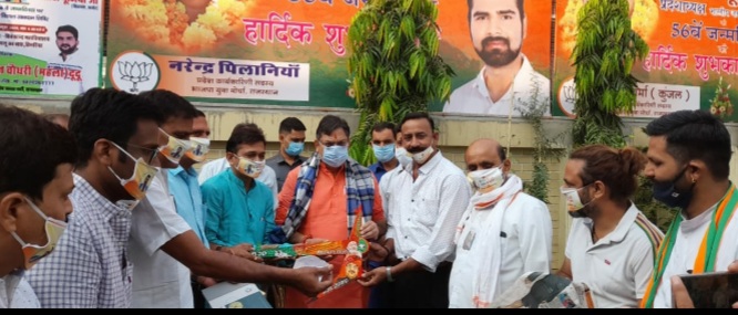 भाजपा के यशस्वी प्रदेश अध्यक्ष सतीश जी पूनिया को भीलवाड़ा जिला भाजपा की ओर से जन्म दिन की हार्दिक बधाई और शुभकामनाएं दी। इस दौरान मांडलगढ़ विधायक गोपाल जी खंडेलवाल भाजपा के पूर्व जिला महामंत्री गजराज सिंह जी राणावत पूर्व जिला उपाध्यक्ष रामलाल जी योगी ओबीसी मोर्चा के जिला प्रभारी राजेश जी सेन कमल पट्टिका अभियान के जिला संयोजक अनुराग जी कोठारी युवा नेता मोहन जी दिया तथा मनफूल जी चौधरी उपस्थित थे। इस अवसर पर यशस्वी प्रदेश अध्यक्ष सतीश जी भाई साहब को किसान कल्याण का प्रतीक चिन्ह हल भेट किया गया। तथा माननीय प्रदेश अध्यक्ष के निर्देशानुसार प्रदेश भर में चल रहे कमल पट्टिका अभियान के तहत अध्यक्ष जी के आवास पर कमल पट्टिका का अनावरण किया गया।