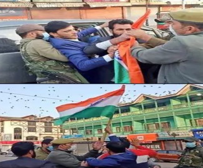 जम्मू-कश्मीर की राजधानी श्रीनगर में सोमवार को तीन भाजपा कार्यकर्ताओं हिरासत में ले लिया गया। भाजपा कार्यकर्ता श्रीनगर के लाल चौक के क्लॉक टॉवर पर तिरंगा फहराने के लिए आग बढ़ रहे थे। इस दौरान कार्यकर्ताओं ने ‘भारत माता की जय’ के नारे भी लगाए। हिरासत में लिए गए कार्यकर्ताओं ने बताया कि वे लोग कश्मीर के भारत में विलय की तारीफ पर जश्न मनाने के लिए आए थे। उन्होंने यह भी कहा कि वे गुपकार घोषणा के सदस्यों को यह संदेश देना चाहते हैं कि कश्मीर में सिर्फ तिरंगा फहरेगा। इस संबंध में एक वीडियो भी सोशल मीडिया पर वायरल हो रहा है जिसमें ये कार्यकर्ता ‘भारत माता की जय’ के नारे लगाते और शहर में तिरंगा फहराते दिख रहे हैं।