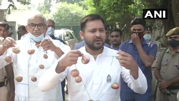 तेजस्वी ने अपने ट्विटर हैंडल पर टवीट कर भी लिखा, ”कमर तोड़ महंगाई, भ्रष्टाचार, बेरोजगारी से आम आदमी त्राहिमाम कर रहा है। काम-धंधा ठप्प है। किसान, मजदूर, नौजवान और व्यापारी वर्ग को खाने के लाले पड़े हैं। छोटे व्यापारियों को भाजपा सरकार ने मार दिया है। महंगाई बढ़ने पर ये लोग प्याज की माला पहन कर घूमते थे अब हम उन्हें यह सौंप रहे हैं।”