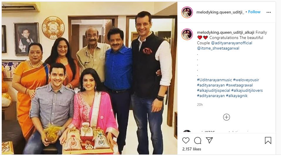 रोका सेरेमनी की तस्वीरें आदित्य के पिता उदित नारायण के एक फैन पेज से शेयर किया गया। इस तस्वीर में आदित्य के पिता उदित नारायण और उनकी मां है और श्वेता की ओर से उनका परिवार है। आदित्य के हाथ में एक नारियल है, जबकि श्वेता के हाथ में शगुन की एक थाली है।