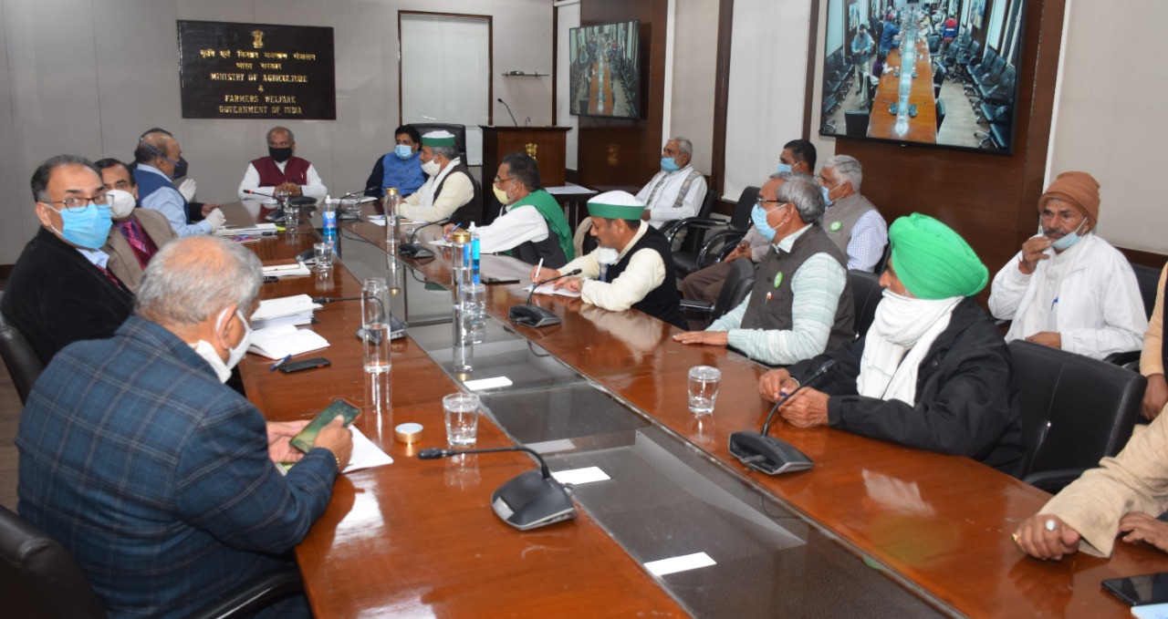 केंद्रीय कृषि और किसान कल्याण मंत्री श्री नरेंद्र सिंह तोमर, रेल और वाणिज्य एवं उद्योग मंत्री श्री पीयूष गोयल तथा वाणिज्य एवं उद्योग राज्य मंत्री श्री सोम प्रकाश ने नई दिल्ली के विज्ञान भवन में 1 दिसंबर2020 को पंजाब-हरियाणा के किसान संगठनों के प्रतिनिधियों के साथ बातचीत की। केंद्रीय मंत्रियों ने कृषि क्षेत्र में सुधार के लिए लाए गए अधिनियमों के लाभ किसान संगठनों के प्रतिनिधियों को समझाएं। साथ ही नए अधिनियमों से संबंधित विभिन्न मुद्दों पर विस्तृत चर्चा की गई।यह बातचीत काफी सकारात्मक और सौहार्दपूर्ण वातावरण में हुई।