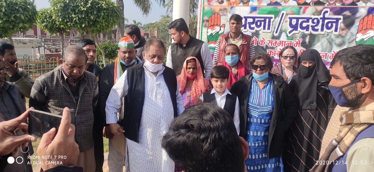 ज़िला एव शहर कांग्रेस कमेटी के पदाधिकारीगण किसानो के समर्थन मे गाधी समाधि पर एकत्र हुए और वही धरने पर बैठ गए उसके बाद उन्होने आन्दोलनरत किसानो के समर्थन मे किसान विरोधी तीनो काले कानून को वापस लेने के संबंध में ज्ञापन सौंपा ज्ञापन मे कहा गया आपको अवगत कराना है हिंदुस्तान में किसान परेशान हो चुका है वह अपनी मांग और अधिकारों को लेकर सड़क पर लड़ रहा है लेकिन केंद्र में बैठी गूंगी बहरी सरकार को उसकी मांगों को मानने के बजाय सरकार आरोप-प्रत्यारोप की राजनीति कर रही है क्या देश के अन्नदाता के साथ ऐसा व्यवहार ठीक है इस ठंडी भीषण ठंड में किसान के ऊपर पानी की बौछार लाठी डंडा चलाना क्या उचित है अगर किसान अपनी मांगों को लेकर सड़क पर आंदोलन कर रहा है तो उसका कारण भी केंद्र सरकार की किसान विरोधी नीतियां है कांग्रेस पार्टी ऐसी किसान विरोधी नीतियों का पुरजोर विरोध करती है और किसानों के आंदोलन को पूर्णता समर्थन देती है तीनों काले कानून किसान विरोधी हैं किसान सड़क पर अपनी लड़ाई का हकदार है उसकी लड़ाई को राजनीतिक रंग ना दिया जाए किसानों की तीनों मांगों को पूरा किया जाए किसान विरोधी काले कानून को तत्काल वापस लिया जाए सरकार की ही गलत नीतियों के कारण आज देश का किसान सड़कों पर है किसान न्याय पाने के लिए लड़ रहे हैं, कांग्रेस पार्टी सरकार को चेतावनी देना चाहती है दमन के तरीके छोड़ दीजिए, डराने की कोशिश मत करिए, किसान डरने वाला नही है। हम किसानों के आंदोलन का दलीय राजनीति के लिए उपयोग नही करना चाहते, लेकिन हम किसानों की उचित मांग का समर्थन करते हैं। और अगर सरकार दमन करेगी, कानून का दुरूपयोग करेगी, शांति पूर्ण आंदोलन को दबाने की कोशिश करेगी तो किसानों के संघर्ष में कूदने में हम संकोच नही करेंगे, हम उनके साथ कंधे से कंधा लगाकर खड़े रहेंगे। हर व्यक्ति को अपने अधिकार की लड़ाई लड़ने का हक है यह हक हमारे देश के संविधान ने हमे दिया है।