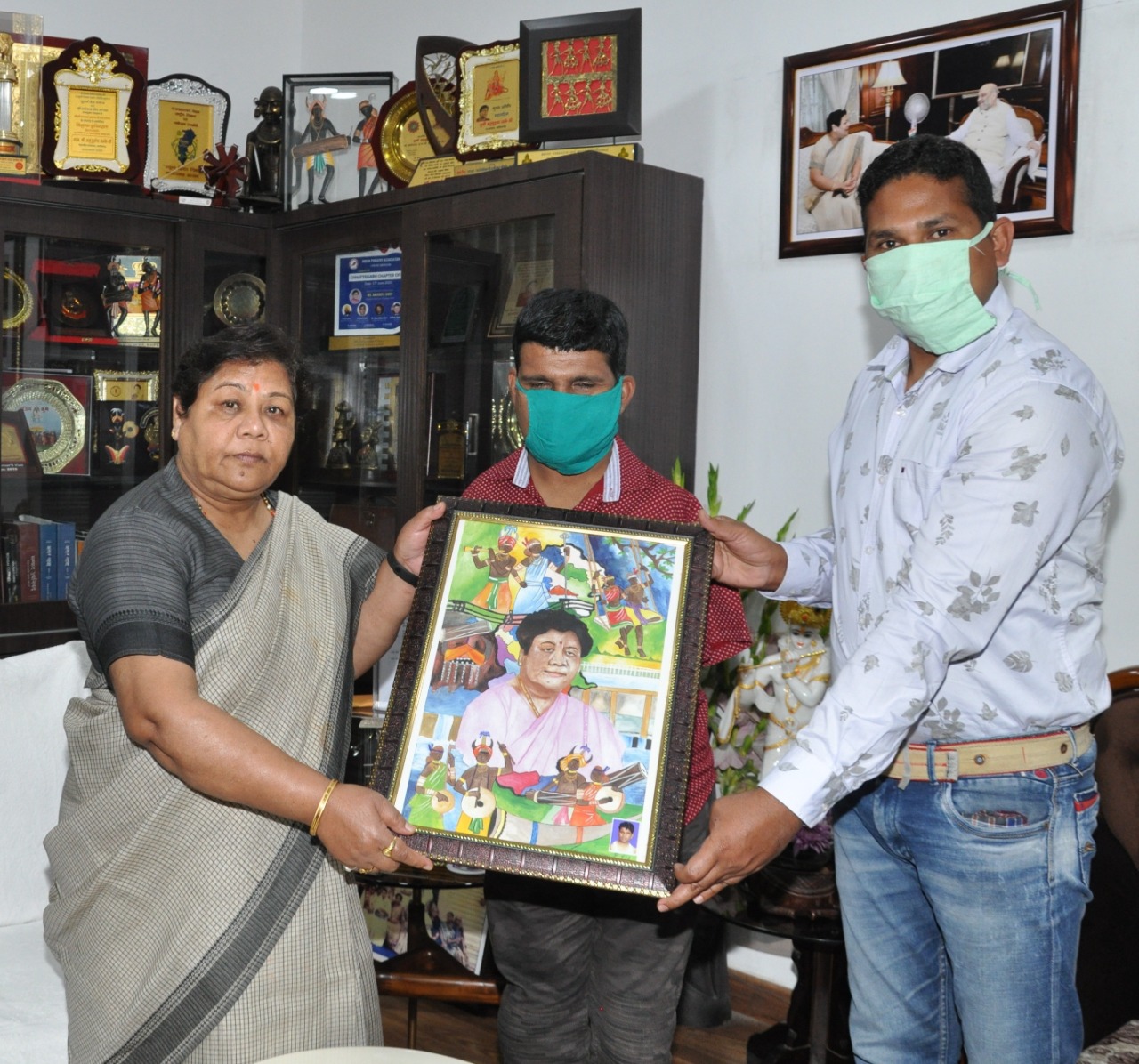 राज्यपाल सुश्री अनुसुईया उइके से राजभवन में दिव्यांग चित्रकार श्री गौकरण पाटिल ने सौजन्य मुलाकात की। उन्होंने राज्यपाल को स्वयं के द्वारा बनाई गई राज्यपाल की एवं राष्ट्रपति की कलाकृति भेंट की। राज्यपाल ने धन्यवाद देते हुए उनकी सराहना की और कहा कि श्री पाटिल ने अपने लगन के बलबूते यह सिद्ध किया है कि यदि किसी व्यक्ति में प्रतिभा हो तो उसे आगे बढ़ने से कोई नहीं रोक सकता। यदि कोई व्यक्ति कुछ करने की ठान ले तो दिव्यांगता किसी की प्रगति में बाधा नहीं बन सकती। राज्यपाल ने उनका शाल एवं श्रीफल से सम्मान किया। गोल्डन एंपथी फाउंडेशन भिलाई के प्रतिनिधि श्री प्रदीप पिल्लई ने बताया कि श्री गौकरण पाटिल बचपन से दिव्यांग है। उनके बनाए गए चित्रों के लिए विभिन्न अवसरों में उन्हें सम्मानित किया गया है।
