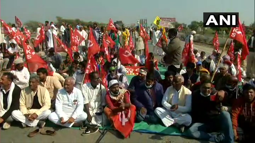 Protesters block national highway near Shahjahanpur border (Rajasthan-Haryana), as part of 'Chakka Jaam' call given by farmers from 12 pm to 3:00 pm today.#FarmLaws pic.twitter.com/QVPyqIndah