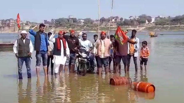 बढ़ती महंगाई से परेशान सपाइयों ने अपनी बाइक और गैस सिलेंडर को किया नदी में विसर्जित