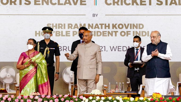 राष्ट्रपति राम नाथ कोविंद ने अहमदाबाद के मोटेरा में सरदार वल्लभभाई पटेल स्पोर्ट्स कॉम्प्लेक्स में दुनिया के सबसे क्रिकेट स्‍टेडियम ‘नरेंद्र मोदी स्‍टेडियम’ का उद्घाटन किया। इस खास मौके पर केंद्रीय गृह मंत्री अमित शाह, खेल मंत्री किरेन रिजिजू और गुजरात के उप मुख्यमंत्री नितिन पटेल भी उपस्थित रहे। बता दें कि मोटेरा स्थित ‘नरेंद्र मोदी स्‍टेडियम’ में आज भारत और इंग्लैंड के बीच सीरीज का तीसरा टेस्ट मैच खेला जाएगा।