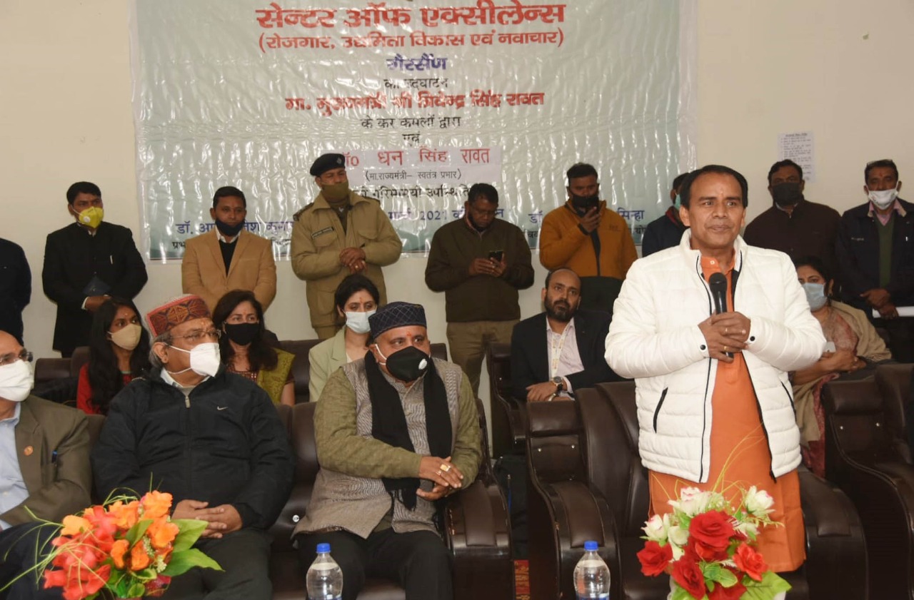उच्च शिक्षा एवं सहकारिता राज्य मंत्री डॉ. धन सिंह रावत ने राजकीय पॉलिटैक्निक गैरसैंण में रोजगार, उद्यमिता विकास एवं नवाचार (सेन्टर ऑफ एक्सीलेंस इन इम्पलाइमेंट) का उद्घाटन किया। सेन्टर ऑफ एक्सीलेस के माध्यम से राज्य सरकार का प्रयास उद्यमिता को बढ़ावा देना तथा स्थानीय उत्पादों में वेल्यू एडिशन कर उन्हें बाजार उपलब्ध कराना है। जिससे युवा स्थानीय स्तर पर ही उद्यम स्थापित कर सके, जो कि पलायन को रोकने में अहम भूमिका निभायेगा। इस अवसर पर उच्च शिक्षा एवं सहकारिता मंत्री डॉ. धन सिंह रावत की उपस्थिति में सेन्टर ऑफ एक्सीलेस एवं कृषि, खाद्य प्रसंस्करण ब्यूटी एण्ड वैलनेस सेक्टर स्किल काउंसिल के साथ एमओयू हुआ। साथ ही राज्य के स्थानीय युवाओं को ट्रैकिंग के क्षेत्र में उपलब्ध अवसरों से जोडने हेतु पर्यटन के क्षेत्र में कार्य कर रही संस्था इंडिया हाइक्स के साथ भी एम0ओ0यू0 किया गया।