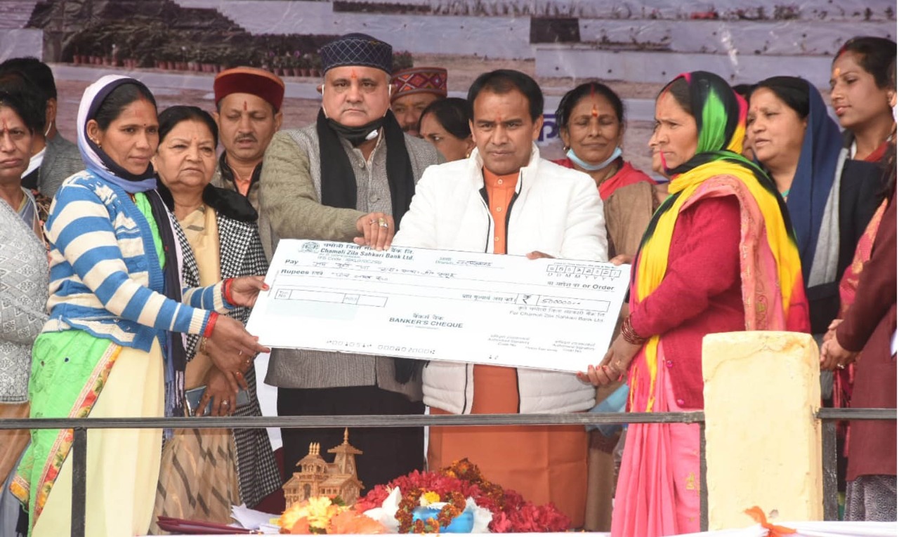 उच्च शिक्षा एवं सहकारिता राज्य मंत्री डा0 धनसिंह रावत ने कार्यक्रम में चमोली जनपद मे सब्जी व दुग्ध उत्पादन, बकरी पालन, झंगोरा व चावल पैकेजिंग, जूस व अचार पैकेजिंग से जुडे 11 महिला स्वयं सहायता समूहों को चैक वितरण किया। जिसमें स्वयं सहायता समूह अनुसूया माता, लक्ष्मी महिला किसान, जय मां बंधाणगढी, वैष्णव देवी, जय मां भगवती, आदित्य देव, नाग देवता, लक्ष्मी स्वयं सहयता समूह सूया, छात्तेश्वर महादेव, जय भूमियाल, जय दुर्गा मां स्वयं सहायता समूह शामिल है।