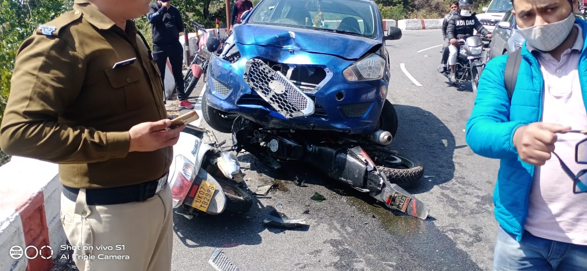 मसूरी कोतवाल देवेन्द्र असवाल ने बताया कि मसूरी देहरादून रोड पर एक डेटसन कार यूके07 बीयू 6105 ने गलत दिशा में आकर एक्सेस स्कूटी यूके07 टीवी 2996 में सवार हितार्थ पुत्र केतन शाह(23) निवासी एमजी रोड गुड़गांव दिल्ली और कंचन राय पुत्री माया देवी राय (26) निवासी गुड़गांव दिल्ली मसूरी घूमने के लिए आ रहे थे वही पल्सर मोटरसाइकिल यूके07 एएस व0412 में अभिषेक पुत्र उमेश चंद(24)निवासी कोटद्वार पौड़ी गढ़वाल व एकता पुत्री मनवीर सिंह पवार (24) निवासी प्रेमनगर देहरादून से मसूरी घूमने आ रहे थे। कार चालक द्वारा मसूरी ेम देहरादून तेज गति में आकर गलत दिशा में आकर टक्कर मार दी। वही गाड़ी छोड़कर चालक फरार हो गया था। उन्होने बताया कि पुलिस द्वारा कार चालक को हिरासत मंे ले लिया है व मामले की जांच की जा रही है। उन्होने बताया कि कार चालक ने बताया कि उसकी कार के ब्रेक फेल हो गए थे वह कारों को बचाने के चक्कर में वह गलत दिशा में जाकर टक्कर लग गई जिससे चपेट में कुछ वाहन में आये गए थे।