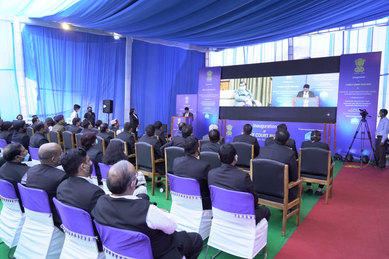 दिनांक 17 मार्च जनवरी 2021 (जि.सू.का), जनपद में नव निर्मित परिवार न्यायालय भवन का माननीय मुख्य न्यायाधीश श्री रघुवेन्द्र सिंह चैहान द्वारा वर्चुअल उद्घाटन किया। इस अवसर पर माननीय मुख्य न्यायाधीश न्यायमुर्ति ने बताया कि उत्तराखण्ड में सबसे ज्यादा वाद जनपद देहरादून में लम्बित है एवं वर्तमान में स्थापित परिवार न्यायालय में जगह कम होने के कारण उपस्थित होने वाले वादकारियों को काफी असुविधा होती है और मामलों में ज्यादा समय तक लम्बित होने के कारण पति पत्नी के मध्य काफी विवाद उत्पन्न हो जाता है जिसका खामियाजा उनके बच्चों को झेलना पड़ता है और उसका असर उनके मानसिक विकास पर पड़ता है।