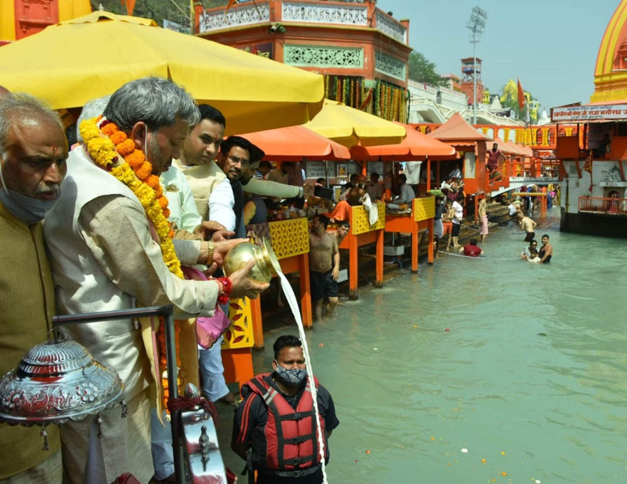 मुख्यमंत्री तीरथ सिंह रावत ने शनिवार को हरकी पैड़ी पहुंचकर मां गंगा की पूजा-अर्चना की। मुख्यमंत्री तीरथ सिंह रावत शनिवार को देहरादून से चलकर हरकी पैड़ी पहुंचे। यहां पर उनका विधानसभा अध्यक्ष प्रेम चन्द्र अग्रवाल, राज्यमंत्री स्वामी यतीश्वरानंद, प्रदेश अध्यक्ष मदन कौशिक, रानीपुर विधायक आदेश चौहान, ज्वालापुर विधायक सुरेश राठौर, भाजपा जिलाध्यक्ष जयपाल सिंह चौहान, जिला महामंत्री विकास तिवारी, मेला अधिष्ठान के अधिकारियों और श्री गंगा सभा के सभापति कृष्ण कुमार शर्मा, अध्यक्ष प्रदीप झा, महामंत्री तन्मय वशिष्ठ, स्वागत मंत्री सिद्धार्थ चक्रपाणी, उज्ज्वल पंडित सहित अन्य लोगों ने स्वागत किया।