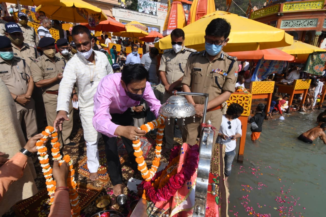 कुम्भ मेला का विधिवत शुभारम्भ मेला अधिकारी दीपक रावत ने हरकीपौड़ी में महाकुम्भ के सफल आयोजन के लिये की पूजा-अर्चना