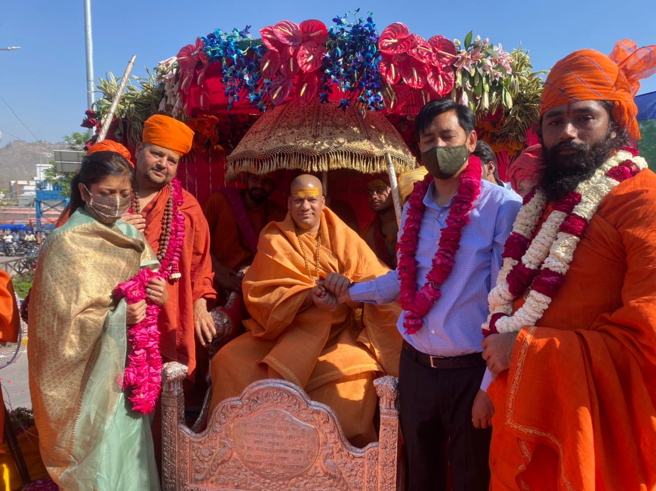 मेलाधिकारी दीपक रावत ने शुक्रवार को तुलसी चौक पर निरंजन पीठाधीश्वर आचार्य महामंडलेश्वर स्वामी कैलाशानंद गिरि महाराज की शोभायात्रा का स्वागत किया।