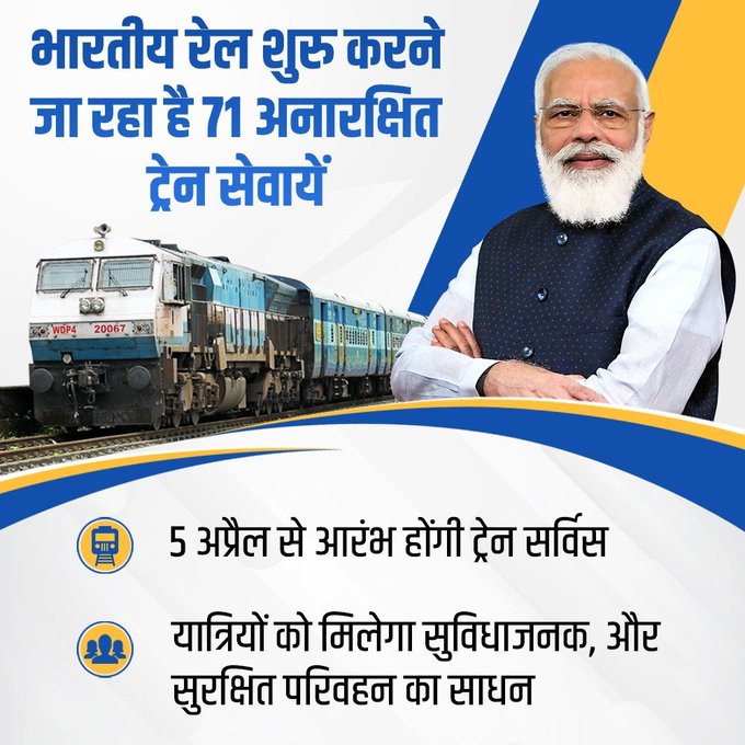 रेल मंत्री पीयूष गोयल ने ट्वीट कर इसकी घोषणा की कहा कि यात्रियों के लिये परिवहन सुविधाओं में बढोत्तरी करते हुए, रेलवे 5 अप्रैल से, 71 अनारक्षित ट्रेन सेवायें आरंभ करने जा रहा है. यह ट्रेनें यात्रियों के सुरक्षित, और आरामदायक सफर को सुनिश्चित करेंगी।