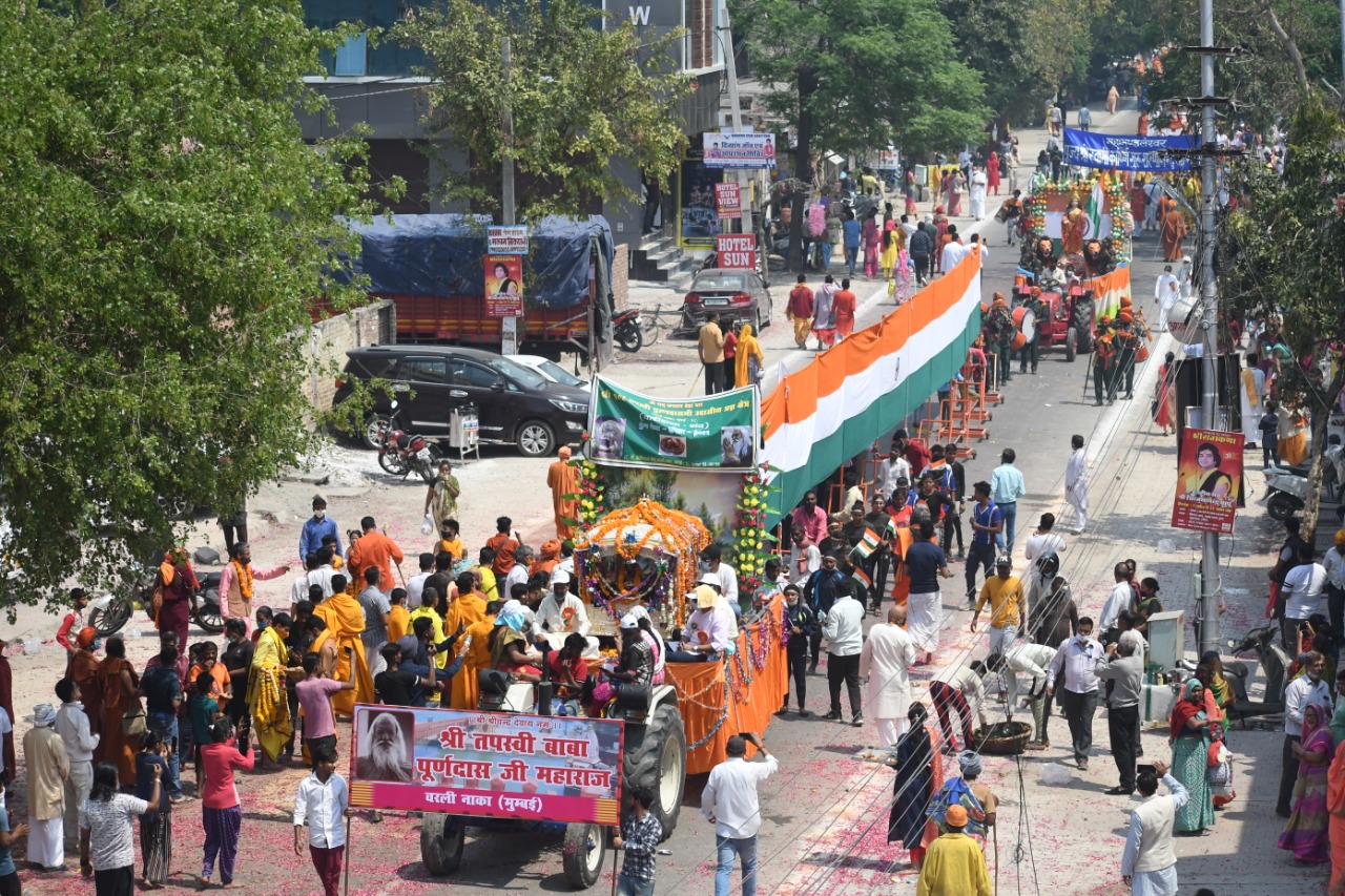इस दौरान हेलीकॉप्टर से पुष्पवर्षा कर पेशवाई में शामिल साधु-संतों का स्वागत किया गया। 100 मीटर का तिरंगा पेशवाई का मुख्य आकर्षण रहा।