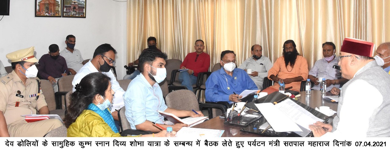 प्रदेश के पर्यटन, सस्कृति, धर्मस्व, सिंचाई, लधु सिंचाई एवं जलागम प्रबन्धन, मंत्री श्री सतपाल महाराज ने देव डोलियों की कुम्भ स्नान की विरासतीय शोभा यात्रा को ऋषिकेश से लेकर हरिद्वार तक सभी जगह देव डोलियों के आवागमन से लेकर देव डोलियों के दर्शन के लिए आने वाले भक्तगणों के आवागमन, मंच-पंडाल जलपान, सुरक्षा, यातायात व भीड़ प्रबन्धन की व्यवस्थाएं सुनिश्चित करने के साथ-साथ सुरक्षा के पुख्ता इंतजाम के भी निर्देश अधिकारियों को दिये। श्री महाराज ने अधिकारियों को शोभा यात्रा का रूट चार्ट बनाते हुए आपसी समन्वय से कार्यक्रम को भव्य स्वरूप प्रदान करते हुए देव डोलियों के गारिमा के अनुकूल सभी तरह की व्यवस्थाएं करने के भी निर्देश दिये। उन्होने सम्बन्धित अधिकारियों को ऋषिकेश एवं हरिद्वार में शोभायात्रा के दौरान देव डोलियों तथा भक्तगणों पर हेलिकाप्टर से पुष्प वर्षा करने के लिए भी निर्देश दिये।