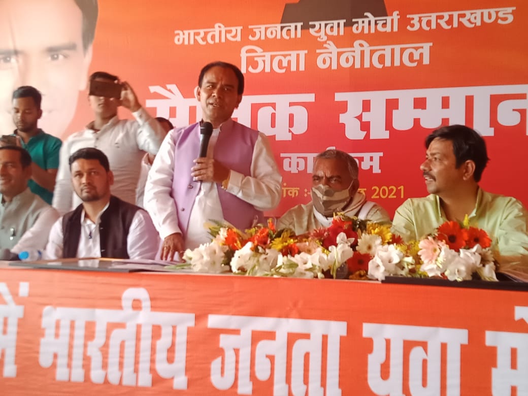 उन्होंने कहा कि बिना किसी औपचारिकताओं के बिंदुखत्ता वासियों को ₹140000 तक का ऋण उपलब्ध कराया जा रहा है भाजपा जिला अध्यक्ष प्रदीप बिष्ट ने कहा कि सैनिकों के दम पर आज हमारे देश की आन बान शान बड़ी है और प्रधानमंत्री नरेंद्र मोदी जी के कुशल नेतृत्व में सैनिक तथा सैन्य परिवारों का मनोबल बढ़ा है उन्होंने भारतीय जनता युवा मोर्चा द्वारा पूरे प्रदेश में किए गए सैनिक सम्मान कार्यक्रमों को सराहनीय बताते हुए कहा कि सैनिकों के सम्मान में पल-पल जुड़े रहना चाहिए इस अवसर पर शहीद वीरांगना को तथा पूर्व सैनिक परिवार से जुड़ी महिलाओं को भी सम्मानित किया गया।