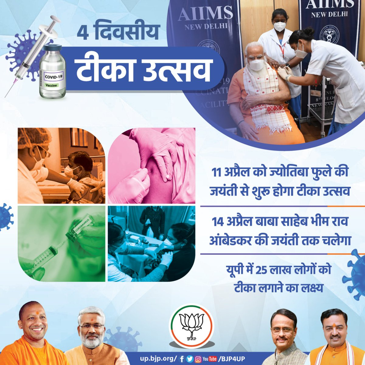 देश भर में चल रहे टीकाकरण अभियान के तहत भाजपा का टीका उत्सव कार्यक्रम शुरू हो गया। प्रदेश में प्रदेश अध्यक्ष श्री मदन कौशिक के निर्देश पर भजपा कर्यकर्ताओ ने अभियान शुरू किया। 4 दिवसीय अभियान ज्योति बा फूले जयंती से 14 अप्रैल अंबेडकर जयंती तक चलेगा। टिकोत्सव के तहत भाजपा कार्यकर्ता टीकाकरण के लिए बनाए गए बुथों पर स्वास्थ्यकर्मियों के सहयोग व लोगों को टीकाकरण के लिए प्रेरित कर कोविड 19 के प्रति जागरूकता का कार्य करेंगे।