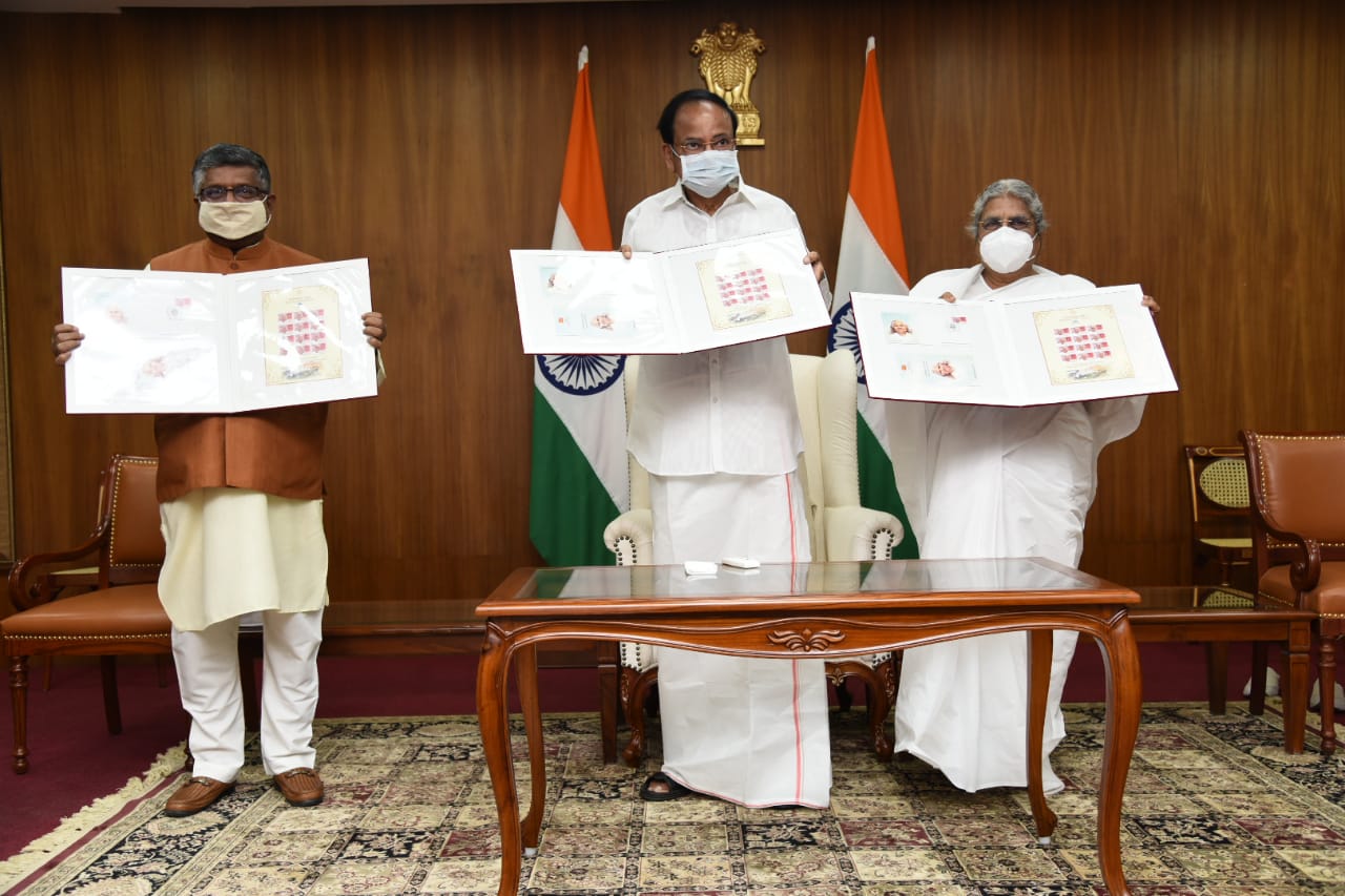 फोटो, 12एबीआरओपी, 1, 2, 3 डॉक टिकट जारी करते उपराष्ट्रपति तथा वेकैय्या नायडू तथा अन्य।