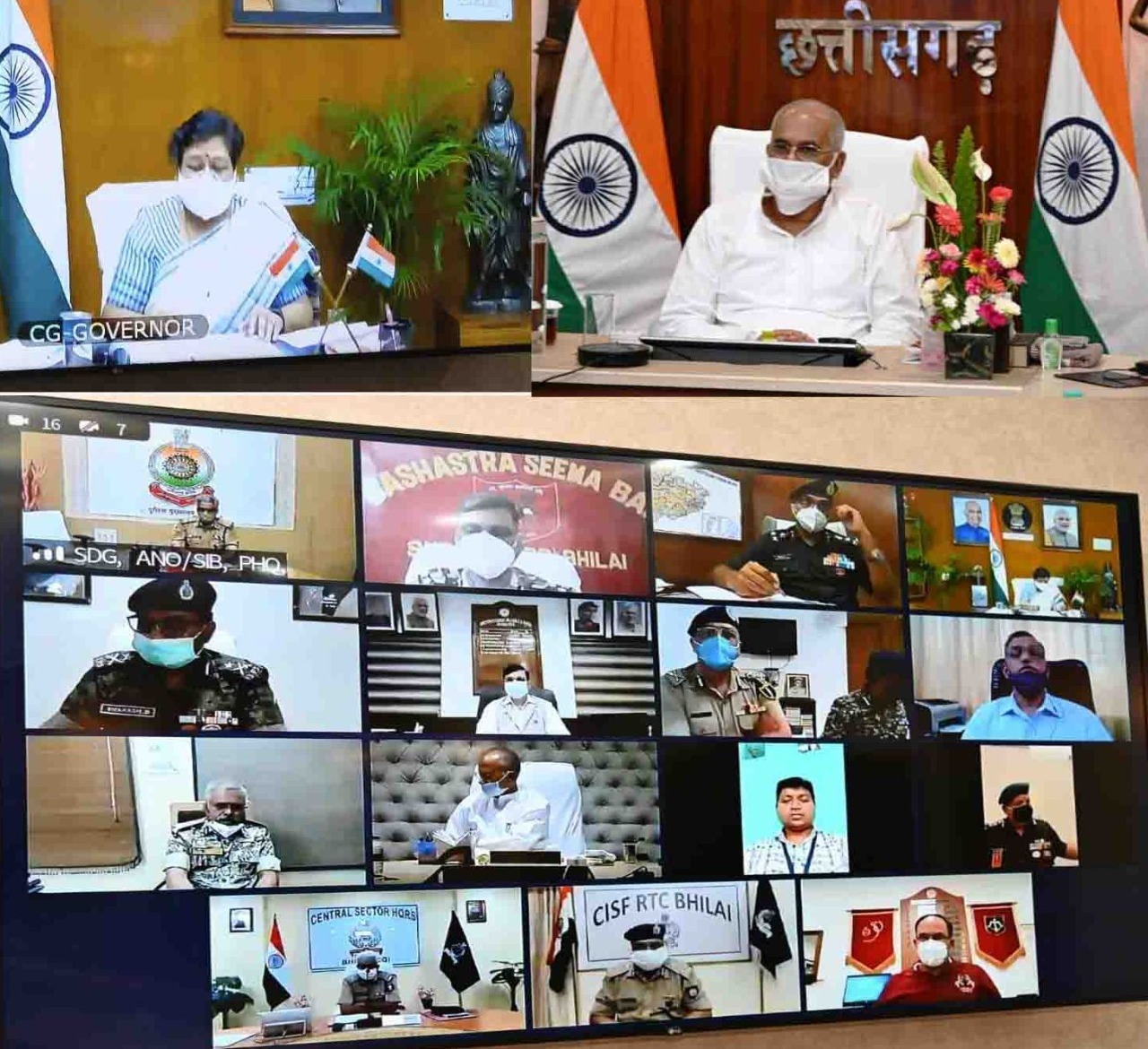 रायपुर, 28 अप्रैल। राज्यपाल सुश्री अनुसूईया उइके की अध्यक्षता में आज आयोजित वर्चुअल बैठक में छत्तीसगढ़ राज्य में तैनात सुरक्षाबल के विभिन्न बटालियन के प्रमुखों, राज्य सैनिक कल्याण बोर्ड तथा एनसीसी के अधिकारियों से राज्य में कोरोना संक्रमण की अद्यतन स्थिति, नियंत्रण एवं बचाव के उपायों सहित पीड़ित एवं जरूरतमंद लोगों की मदद को लेकर विस्तार से चर्चा की गई। बैठक में मुख्यमंत्री श्री भूपेश बघेल, गृह मंत्री श्री ताम्रध्वज साहू, मुख्य सचिव अमिताभ जैन, अपर मुख्य सचिव गृह श्री सुब्रत साहू, डीजीपी श्री डी.एम. अवस्थी मौजूद थे।