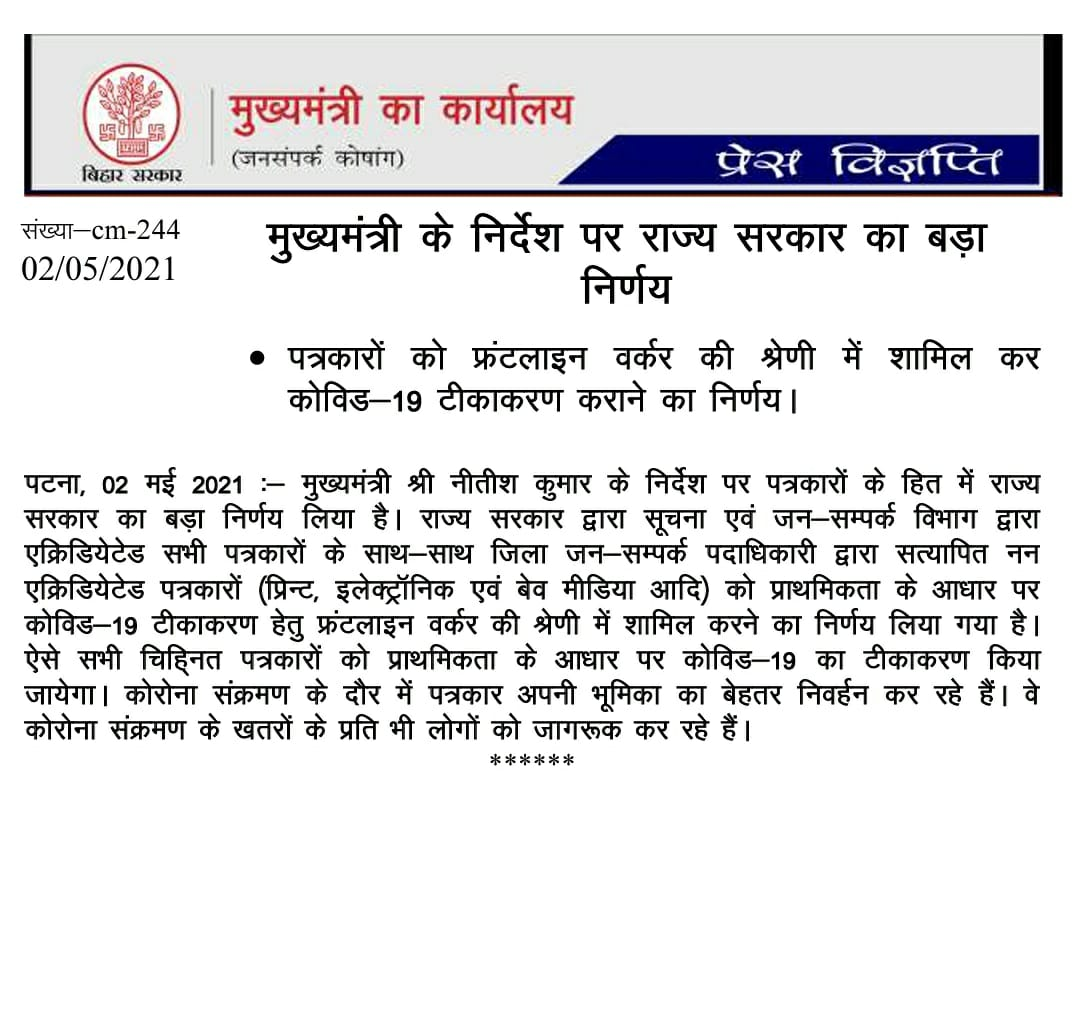 मुख्यमंत्री नीतीश कुमार के निर्देश पर पत्रकारों के हित मे राज्य सरकार ने यह निर्णय लिया गया है। राज्य सरकार द्वारा सूचना एवं जनसंपर्क विभाग द्वारा एक्रीडिएटेड पत्रकारों के साथ साथ जिला जन सम्पर्क पदाधिकारी द्वारा सत्यापित नन एक्रीडिएटेड पत्रकार जिसमें प्रिंट इलेक्ट्रॉनिक और वेब के पत्रकार शामिल हैं। उन्हें प्राथमिकता के आधार पर कोविड 19 का टीकाकरण किया जाएगा। कहा गया है कि कोरोना संक्रमण के दौर में अपनी भूमिका बेहतर ढंग से निर्वहन कर रहे हैं। ये कोरोना संक्रमण से खतरे के प्रति लोगों को जागरूक कर रहे हैं।