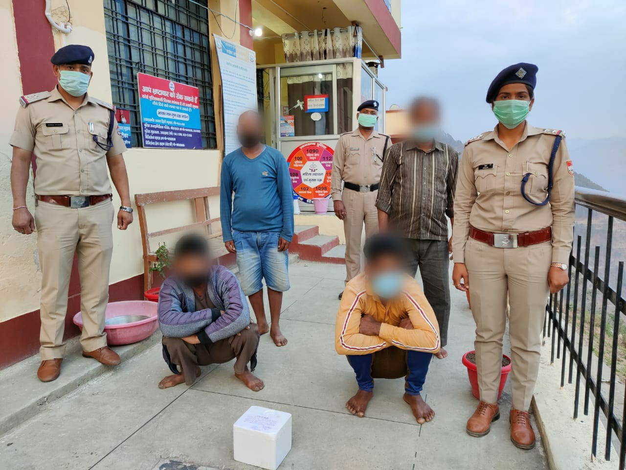 अभियुक्त रमेश पुत्र गल्तु, उम्र- 50 वर्ष, जगदीश पुत्र रमेश, उम्र- 27 वर्ष, दिनेश पुत्र फुणकु (क्रेता), उम्र- 34 वर्ष, भगवान पुत्र लूङा (क्रेता), उम्र- 35 वर्ष। निवासीगण ग्राम नगर, पट्टी तौली, बनगढ, थाना हिण्डोलाखाल, टिहरी गढवाल। अभियुक्त रमेश एवं जगदीश (पिता-पुत्र) जो कि मांस का विक्रय कर रहे थे, उनके कब्जे से संयुक्त रुप से करीब 21 किग्रा0 वन्य हिरन का मांस एवं अभियुक्त दिनेश एवं भगवान (क्रेता) के कब्जे से क्रमशः 3.5 किग्रा0 तथा 2 किग्रा0 वन्य हिरन का मांस बरामद किया गया है। इस तरह के नाजायज़ शिकार करने से कोविड संक्रमण का वन एवं में भी फैलना का खतरा बढ़ गया है।