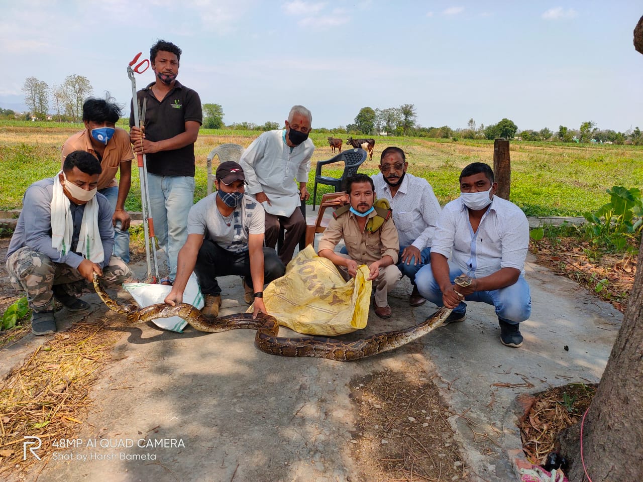 हल्दूचौड़, 13मई। गुरुवार की दोपहर निकटवर्ती ग्राम भांदेवनवाड़ गाँव निवासी भुवन चन्द्र के घर में 10 फीट लंबा अजगर घुस गया। जब ग्रामीणों ने इस विशाल अजगर को देखा तो अफरा-तफरी मच गई। मौके पर भीड़ लग गई। सूचना पर वन विभाग की टीम मौके पर पहुंची। जिसके बाद अजगर को पकड़ा जा सका। गृहस्वामी ने बताया कि जब वे लोग घर के पीछे की तरफ जा रहे थे, तब उनकी नजर अजगर पर पड़ी। अजगर आंगन में घूम रहा था जिसके बाद सूचना पर बड़ी संख्या में ग्रामीण मौके पर जुट गए। सूचना मिलते ही वन विभाग की टीम भी मौके पर पहुंची। अजगर को घंटो मशक्कत के बाद पकड़ लिया गया। वन विभाग ने इस अजगर को जंगल में सुरक्षित छोड़ दिया है। वन विभाग द्वारा ग्रामीणों के सहयोग से सापों का सुरक्षित रैक्सयू कर बचाया जा रहा है जो सराहनीय पहल है। वन कर्मियों व ग्रामीणों की जागरूकता के कारण अब तक सैकड़ों सापों की जान बचाई गई है। अजगर को रैक्सयू करने वाली वन महकमे की टीम में वन क्षेत्राधिकारी उमेश आर्य वन दरोगा नवीन रैकवाल वन बीट अधिकारी कमल सिंह वन आरक्षी पृथ्वीराज सिंह कासिम रजा जैदी आदि शामिल रहे।