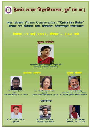 इस अवसर पर ऑनलाइन कार्यशाला में अंतर्राष्ट्रीय ख्याति प्राप्त तथा जल संरक्षण हेतु ‘‘वाटरमैन ऑफ इंडिया“ के रूप में जाने जाने वाले श्री राजेन्द्र सिंह, उच्च शिक्षा विभाग के सचिव श्री धनंजय देवांगन, विश्वविद्यालय के कुलपति डा. श्रीमती अरुणा पल्टा, एवं संबंधित विभाग के अधिकारीगण उपस्थित थे।