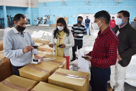 जिलाधिकारी स्वाति एस भदौरिया ने जिम हॉल में ब्लाकों के लिए तैयार किए जा रहे मेडिकल सामग्री का निरीक्षण किया। उन्होंने आइवरमेक्टिन टैबलेट एवं अन्य उपलब्ध सामान को डिस्ट्रीब्यूसन प्लान के अनुसार ब्लाक वाइज बंडल तैयार करते हुए तत्काल सभी ब्लाकों तक पहुंचाने के निर्देश दिए। कहा कि सभी आशा, एएनएम, एमएलएचपी, ग्राम पंचायत, बीएलओ सहित ब्लाक एवं तहसीलों तक पल्स ऑक्सीमीटर, थर्मामीटर, सेनेटाइजर, फेससील्ड, एन-95 मास्क, पीपीई किट, कोविड एंटीजन किट यथाशीघ्र उपलब्ध कराना सुनिश्चित करें।