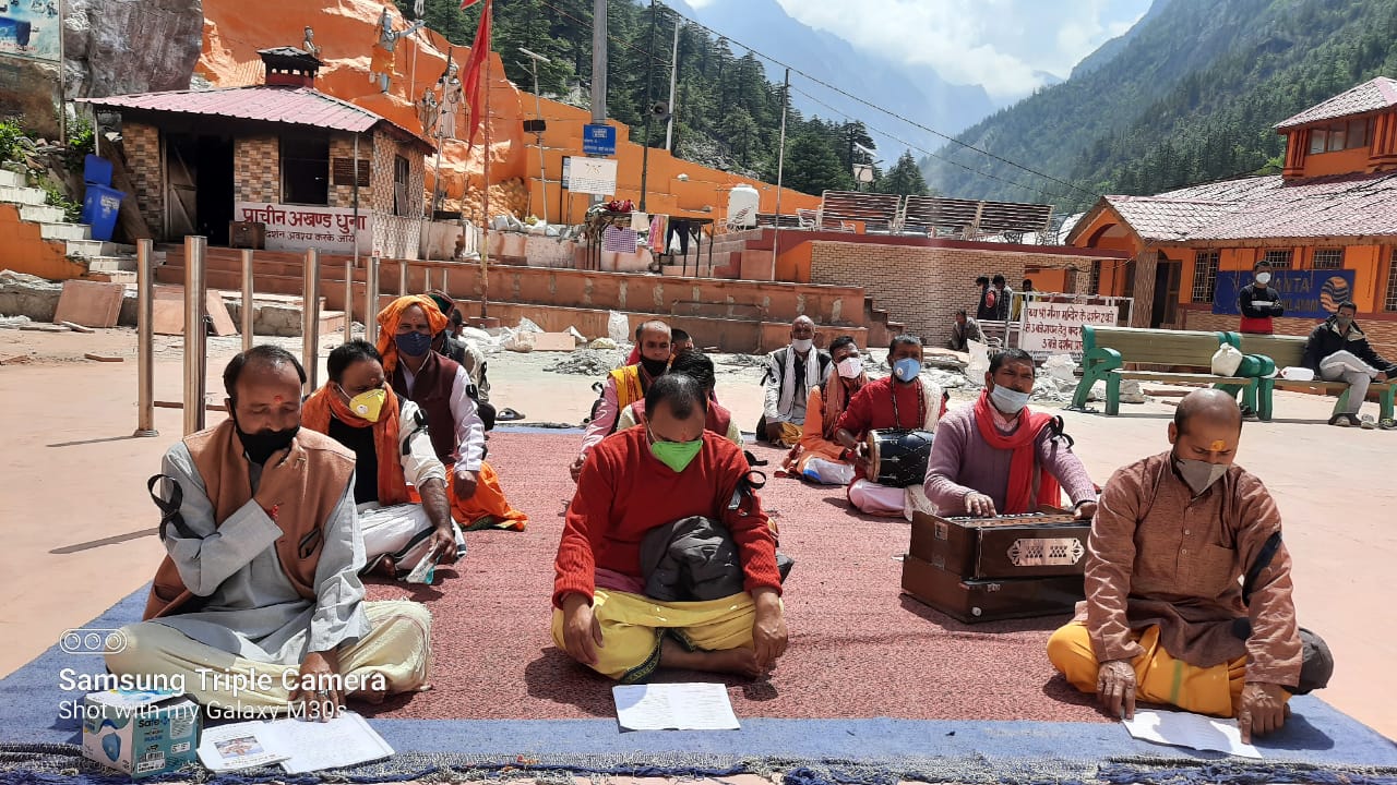 देवस्थानम बोर्ड को भंग करने की मांग को लेकर शुक्रवार को गंगोत्री मंदिर में पुरोहितों ने काली पट्टी बांधकर किया पूजा-पाठ
