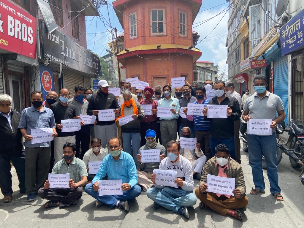 पिछले लॉकडाउन के बाद अब कोरोना कर्फ्यू में लगातार बाजार बंद होने से परेशान व्यापारियों ने किया धरना प्रदर्शन