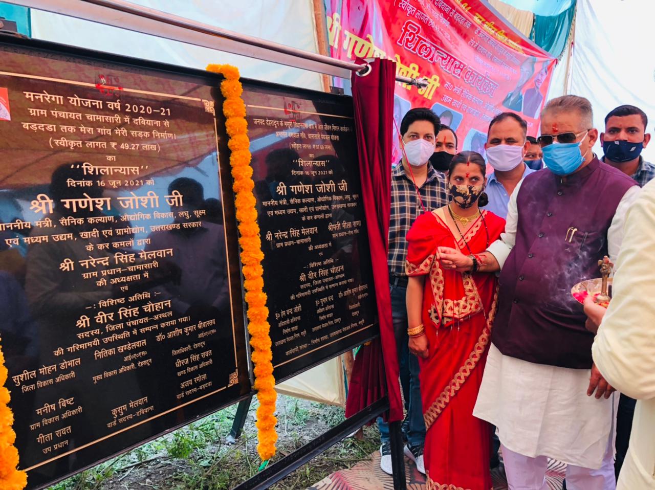 देहरादून, 16 जून। राज्य के औद्योगिक विकास एंव सैनिक कल्याण, खादी एवं ग्रामोद्योग मंत्री गणेश जोशी ने मसूरी विधानसभा क्षेत्र के ग्राम पंचायत चामासारी में मेरा गांव मेरी सड़क योजना के तहत रुपये 49.27 लाख की लागत से दबियाना से बड़दड़ा तक सड़क निर्माण के कार्य एवं जल जीवन मिशन के तहत रुपये 97.69 लाख की लागत से बनने वाली बसवालगांव चामासारी पेयजल योजना का शिलान्यास किया। उन्होनें चामासारी पंचायत में सामुदायिक भवन एवं खेतवाला में पंचायत घर बनाने की घोषणा भी की।