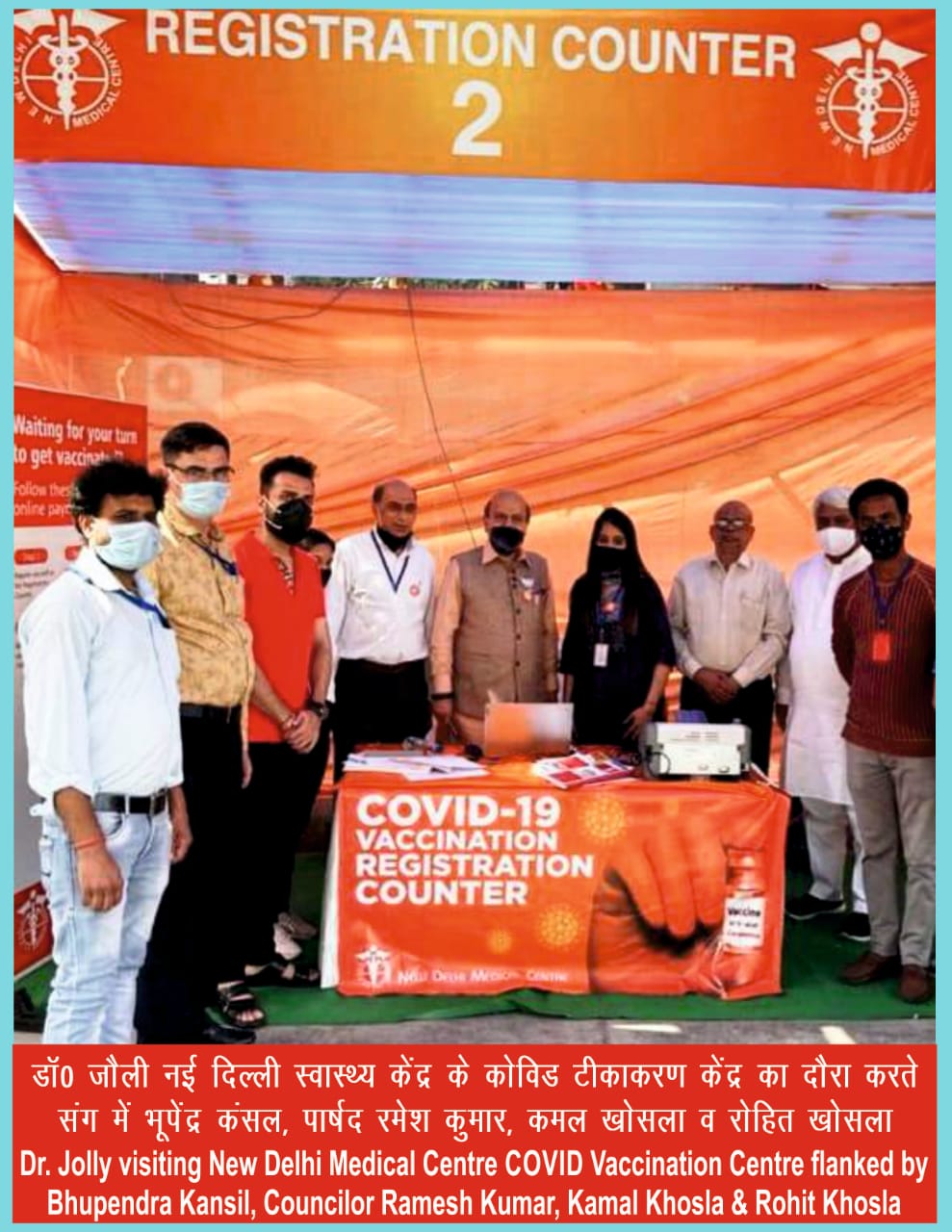 हेमकुंट बिल्डिंग, राजेन्द्र प्लेस, नई दिल्ली स्थित ‘‘नई दिल्ली स्वास्थ्य केंद्र’’ में ‘‘ड्राइव इन – कोविड टीकाकरण केंद्र’’ जा कर भाजपा नेता डॉ जौली ने, आयोजकों व टीका लगवाने वालों का उत्साह वर्धन किया।