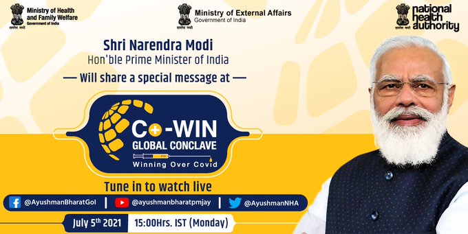राष्ट्रीय स्वास्थ्य प्राधिकरण ने अपने ट्वीट में कहा कि हमें यह घोषणा करते हुए खुशी हो रही है कि प्रधानमंत्री नरेंद्र मोदी कोविन ग्लोबल कॉनक्लेव में अपने विचारों को शेयर करेंगे और कोरोना के खिलाफ लड़ाई में दुनिया को कोविन की पेशकश करेंगे. बता दें कि इस कार्यक्रम में केंद्रीय स्वास्थ्य मंत्री डॉ. हर्षवर्धन भी शामिल होंगे।