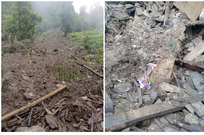 बागेश्वार जिले के कपकोट तहसील के सुमगढ़ गांव में मूसलाधार बारिश से पहाड़ी भरभरा कर गिर गयी। भूस्खलन से एक मकान मलबे में दब गया है। मकान में रहने वाले तीन लोगों की मलबे में दबकर दर्दनाक मौत हो गयी। हालांकि एक बच्चे की जान बची गई है।