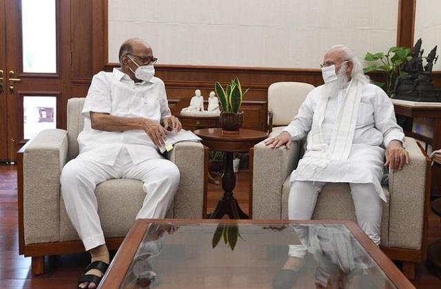 नई दिल्ली, 17जुलाई। राष्ट्रवादी कांग्रेस पार्टी (राकांपा) के प्रमुख शरद पवार ने शनिवार को प्रधानमंत्री नरेंद्र मोदी से मुलाकात की. प्रधानमंत्री कार्यालय (पीएमओ) ने ट्वीट कर यह जानकारी दी. पीएमओ ने दोनों नेताओं की मुलाकात की एक तस्वीर भी शेयर की. दोनों नेताओं के बीच तकरीबन एक घंटे तक हुई. इस मुलाकात में क्या बात हुई इस बारे में कोई आधिकारिक जानकारी नहीं दी गई, लेकिन सूत्रों का कहना है कि उन्होंने ताजा राजनीतिक मुद्दों पर चर्चा की।