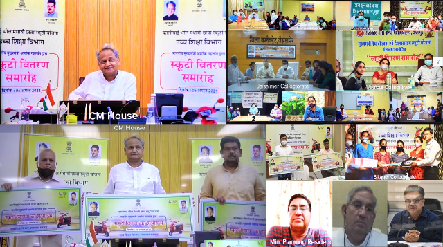 मुख्यमंत्री श्री अशोक गहलोत ने शुक्रवार को मुख्यमंत्री निवास से वीडियो कॉन्फ्रेंस से आयोजित कालीबाई भील मेधावी छात्रा स्कूटी योजना के शुभारंभ समारोह के दौरान स्कूटी प्राप्त करने वाली लाभार्थी छात्राओं से संवाद कर रहे थे। उन्होंने छात्राओं से उनकी पढ़ाई, परिवार की स्थिति, करिअर के लक्ष्य पर चर्चा की तथा बालिका शिक्षा को प्रोत्साहन देने के लिए शुरू की गई योजनाओं पर फीडबैक लिया। उन्होंने उच्च शिक्षा विभाग के अधिकारियों, जिला कलक्टरों और कॉलेज प्राचार्यों को निर्देश दिए कि विद्यार्थियों के लिए शुरू की गई सभी योजनाओं का लाभ जरूरतमंद एवं पात्र छात्र-छात्राओं तक पहुंचाना सुनिश्चित करें।