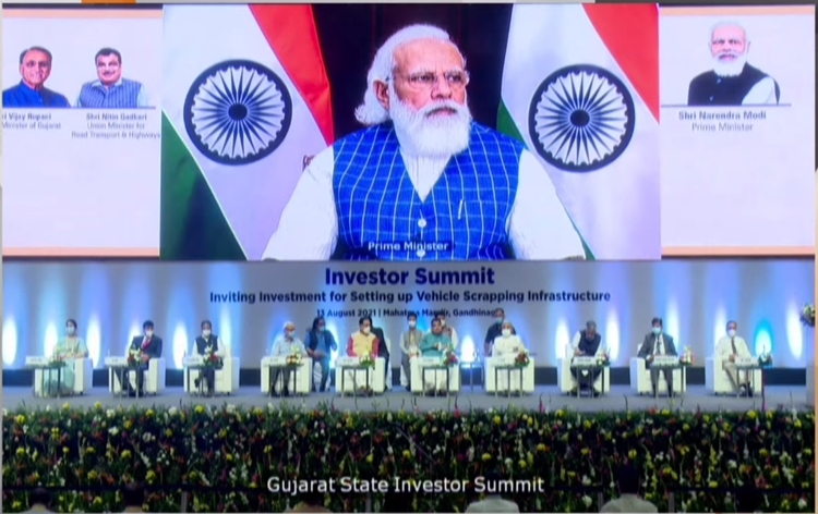 नई दिल्ली , 13 अगस्त। प्रधानमंत्री श्री नरेन्द्र मोदी ने वीडियो कॉन्फ्रेंस के माध्यम से गुजरात में आयोजित निवेशक शिखर सम्मेलन को संबोधित किया। स्वैच्छिक वाहन-बेड़ा आधुनिकीकरण कार्यक्रम या वाहन स्क्रैप नीति के तहत वाहन स्क्रैप के बुनियादी ढांचे की स्थापना के लिए निवेश आमंत्रित करने के लक्ष्य को ध्यान में रखते हुए इस शिखर सम्मेलन का आयोजन किया गया है। सम्मलेन में एकीकृत स्क्रैप हब के विकास के लिए अलंग स्थित जहाज तोड़ने वाले उद्योग द्वारा प्रस्तुत सुझाव व ताल-मेल पर भी विचार-विमर्श किया जायेगा। इस अवसर पर केंद्रीय सड़क परिवहन और राजमार्ग मंत्री तथा गुजरात के मुख्यमंत्री भी उपस्थित थे।