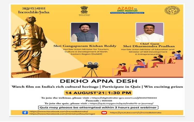 नई दिल्ली, 14 अगस्त। भारत के 75वें स्वतंत्रता दिवस समारोह की पूर्व संध्या, 14 अगस्त 2021, शनिवार को, दोपहर 1.30 बजे पर्यटन मंत्रालय, एसोसिएशन ऑफ इंडियन यूनिवर्सिटीज (एआईयू) के साथ मिलकर 12 एपिसोड की एक सीरीज लॉन्च करेगा जो प्रतिभागियों को अतुल्य भारत की वर्चुअल यात्रा पर ले जाएगा। इस कार्यक्रम का शुभारम्भ केंद्रीय पर्यटन, संस्कृति और उत्तर पूर्व क्षेत्र विकास (डीओएनईआर) मंत्री श्री जी. किशन रेड्डी द्वारा किया जाएगा। केंद्रीय शिक्षा और कौशल विकास एवं उद्यमिता मंत्री श्री धर्मेंद्र प्रधान इस कार्यक्रम में मुख्य अतिथि के रूप में उपस्थित रहेंगे।