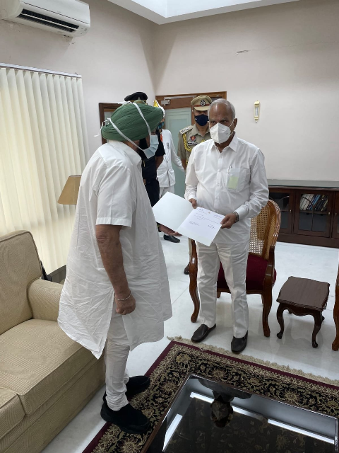 पंजाब के मुख्यमंत्री कैप्टन अमरिंदर सिंह ने चंडीगढ़ के राजभवन में राज्यपाल बनवारीलाल पुरोहित को अपना इस्तीफा सौंप दिया है।