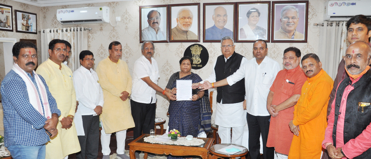 पूर्व मुख्यमंत्री डॉ. रमन सिंह के नेतृत्व में प्रतिनिधिमण्डल ने राज्यपाल को कवर्धा घटना के संबंध में सौंपा ज्ञापन