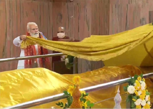 इसके साथ ही पीएम मोदी देश के ऐसे पहले प्रधानमंत्री बने है जिन्होंने महापरिनिर्वाण स्थल में बुद्ध प्रतिमा पर चीवर चढ़ाया। इससे पहले मोदी भगवान बुद्ध के महापरिनिर्वाण स्तूप पहुंचे। यहां शयनमुद्रा में पश्चिम दिशा की तरफ सिर कर लेटे भगवान बुद्ध की प्रतिमा का पूजा की। 6 मीटर लंबा चीवर दान किया। चीवर बौद्ध भिक्षु धारण करते हैं। यहां भगवान बुद्ध ने अपना अंतिम समय यहीं बिताया था। यहीं अपने भौतिक शरीर का त्याग किया था। PM ने मंदिर परिसर में पीपल का पौध लगाया है।