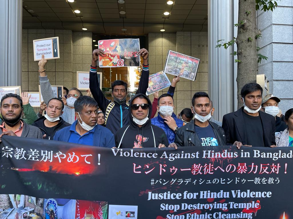 टोक्यो, 25 अक्टूबर। जापान में हिंदू समुदाय ने श्री दुर्गा पूजा के पवित्र हिंदू त्योहार के दौरान बांग्लादेश में हिंदू परिवारों और हिंदू मंदिरों पर मॉब लिंचिंग और सांप्रदायिक हमले को लेकर बांग्लादेश दूतावास के पास शांतिपूर्ण कीर्तन विरोध प्रदर्शन किया है।