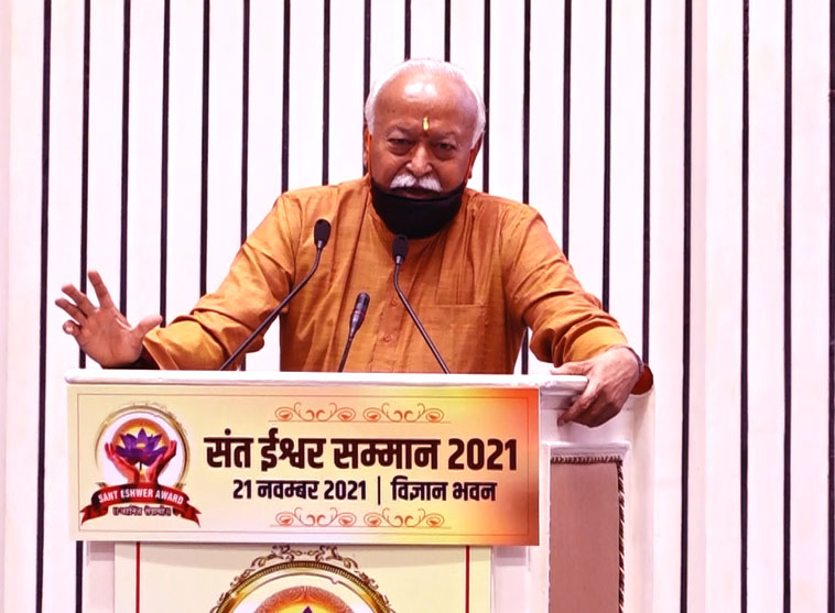 संत ईश्वर सम्मान में श्री भागवत ने कहा कि समाज के विभिन्न क्षेत्रों में स्वप्रेरणा से निस्वार्थ भाव से कार्य करने वाले को सम्मानित करते हुए कहा कि भारतीय समाज की संरचना ऐसी है कि वह किसी का विरोध नहीं करता। समाज में रहने वाले व्यक्ति पूजा पद्धति को अपनाए या न अपनाए लेकिन समाज का हर व्यक्ति ‘सेवा’ भाव से अपनी क्षमता अनुसार कार्य करता है। यही एक कार्य है जो मनुष्यता का स्वरुप है। मनुष्य में यह भाव तभी आता है जब वह पूरी तरह से करुणा, सदाचार, पवित्रता और संयम युक्त हो और किसी के विरोध में नहीं बल्कि सबको साथ लेकर चलने में विश्वास रखता है। उन्होंने कहा कि भारतीय समाज की सबसे बड़ी खूबी यही है कि वह सदियों से सबको प्रेरित करती रही है और आगे भी युवा पीढ़ी को प्रेरित करती रहेंगी।