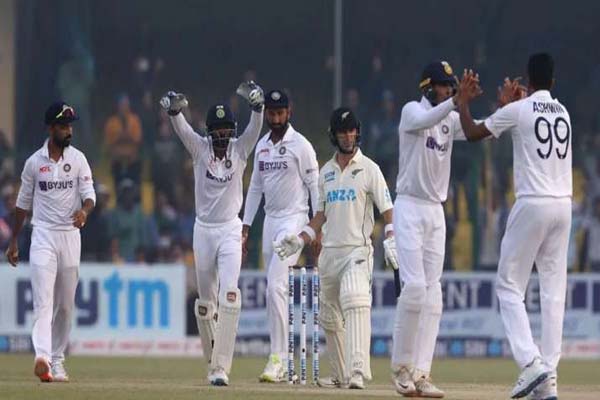 ग्रीनपार्क मैदान पर भारत ने अपनी पहली पारी में 345 रन बनाये थे जिसके जवाब में न्यूजीलैंड की पहली पारी 296 रन पर सिमट गयी थी। पहली पारी में 49 रन की महत्वपूर्ण लीड लेने के बाद भारत ने आज दूसरी पारी सात विकेट पर 234 रन पर घाेषित कर दी। मेहमान टीम की दूसरी पारी के आज महज चार ओवर के खेल मे रविचंद्रन अश्विन ने सलामी बल्लेबाज विल यंग को महज दो रनों के निजी स्कोर पर पगबाधा आउट कर भारतीय टीम को जीत की ओर एक कदम चलवा दिया। दिन का खेल खत्म होने के समय टाम लाथम (2) और नाइट वाच मैन की भूमिका में विलियम सोमरविल बगैर खाता खोले क्रीज पर डटे हुये थे।