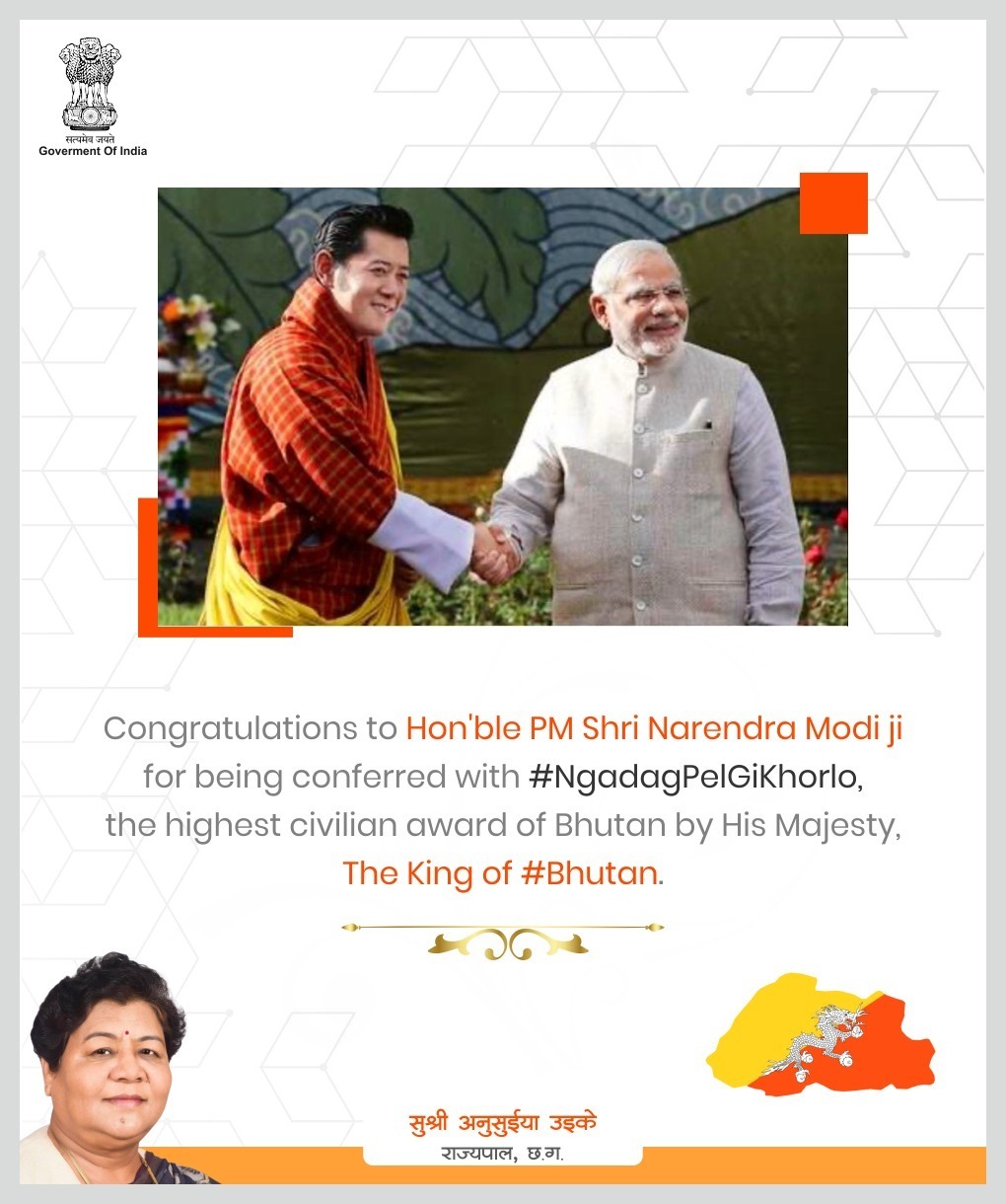 राज्यपाल छत्तीसगढ अनुसुईया उइके ने पीएम नरेन्द्र मोदी को भूटान का सर्वोच्च नागरिक सम्मान मिलने पर दी हार्दिक बधाई