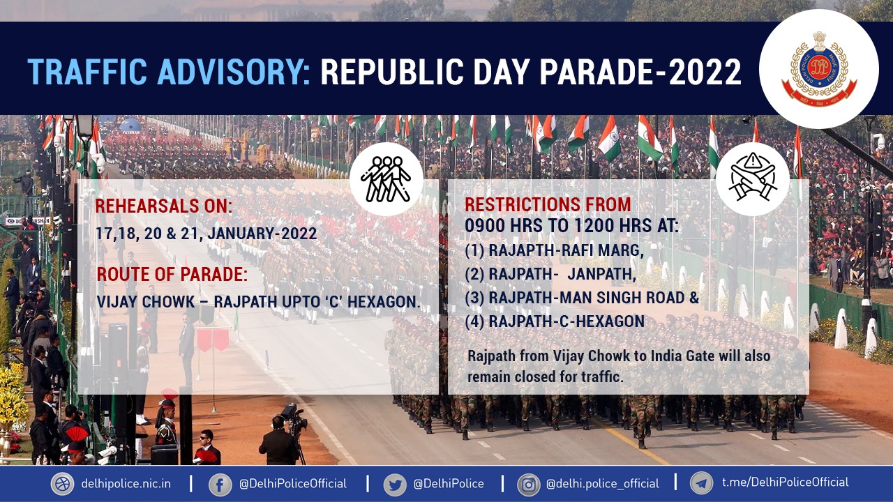 Elaborate traffic arrangements have been put in place for #RepublicDay2022 Parade Rehearsals from 17-21 Jan. @dtptraffic is committed to ensure smooth flow of vehicular movement. #DelhiPolice urges you to follow Traffic Advisory and latest updates.#DelhiPoliceUpdates@CPDelhi pic.twitter.com/vBHuanqUfp